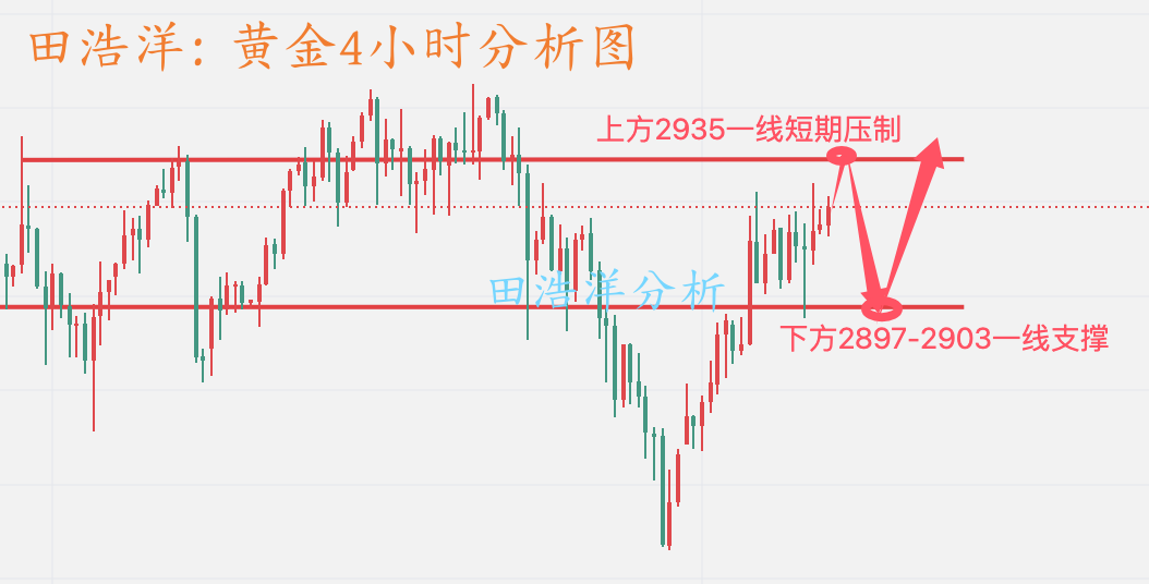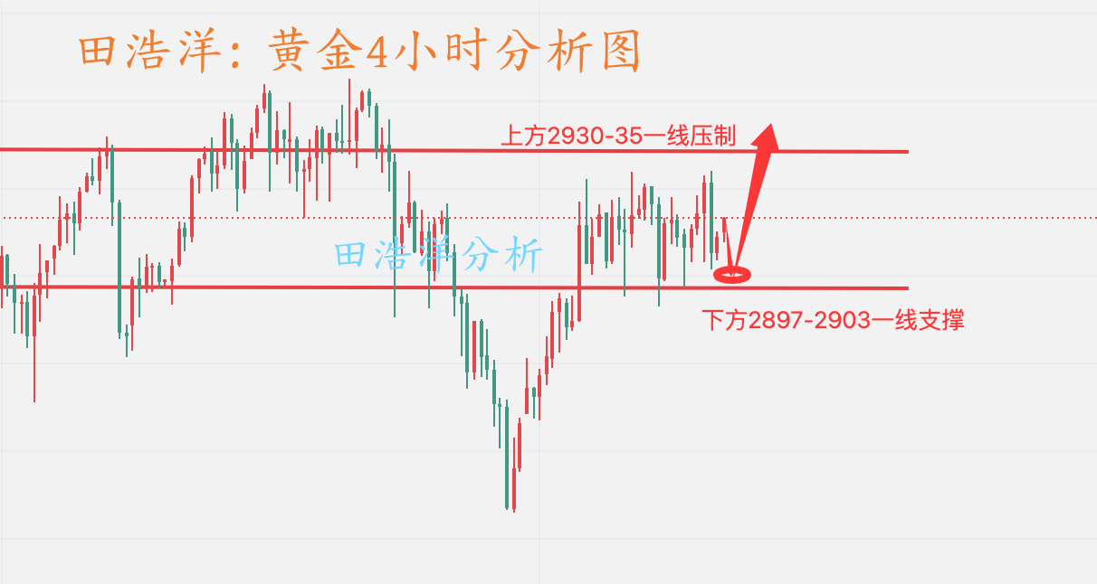 黄金今天迎来了新的一周开盘,新的一周我们要充满希望,黄金开盘在2912一线,最低触及2909附近开启震荡上行模式,从结构上来讲,黄金依旧是处于受下方支撑附近反弹,多头依旧是目前的主要趋势,回顾上周,每次的回踩调整都会迎来新的冲刺,非农也是没有打破上周五我们给出的操作区间,相信关注我的朋友都看到过,今天我们依旧是先关注区间2897-2903一线到上方2930-35一线,暂时先以此对待,回踩做多进行着,如果你目前黄金操作不理想,希望田浩洋能让你的投资少走弯路,欢迎前来沟通交流! 从4小时黄金走势分析来看,下方我们关注2897-2903一线支撑,上方关注2930-35一线压制,操作上我们依旧是回踩