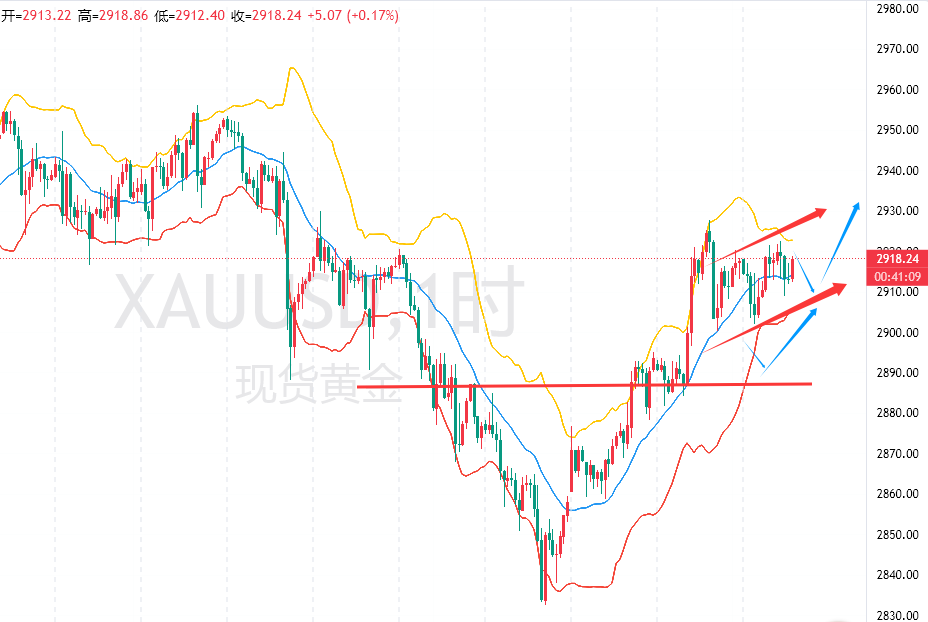 黄金分析: 黄金日线昨日继续收阳,收盘价又是略微站上MA10日,则还需今日收线形态来进一步确认;一旦继续收阳,那么短期就正式结束下调,回归强势逐步拉升;今日回踩支撑则是中轨2902-2900,另外就是MA5日支撑2892-2890,这两个位置上企稳依旧维持看涨;当然希望是中轨直接能撑住,因为回测小,才能进一步加大拉升动能;回测大了,也难破新高,容易步入震荡;阻力比较明确,就是2930,暂时有小双顶压制,若能收盘站上,就具备冲击2956历史高点的概率; 黄金隔夜支撑2900反抽一波至2920,重新站上年均线2912之上,也是日线MA10日位置,同时看到白银收线比较强,黄金小时线中轨也逐步上移靠