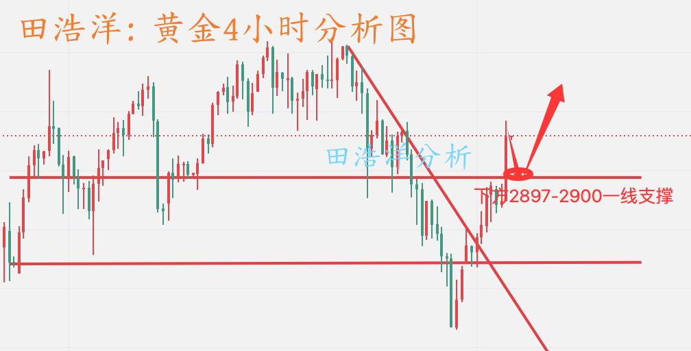 近期黄金三个交易日最低从2832一线涨到了2927一线,在K线形态上形成了一个大大的V字形态,多头已经重新崛起了,昨天我们分析就说了2897-2903一线破了基本都是多头,周三的黄金我们此位置的支撑去布局多单,黄金完美达到了我们的目标点位2920-25一线,相信关注我的朋友都可以看到,黄金美盘小非农利多没有上涨,黄金向下破至2894一线开始反弹,我们实盘给了2900一线做多,2895一线补仓做多已经达到目标,随后黄金继续冲击2930一线受压震荡回落,近期涨跌幅度都非常大,在操作上一定要严格带损。如果你目前黄金操作不理想,希望田浩洋能让你的投资少走弯路,欢迎前来沟通交流! 从目前黄金走势来看,
