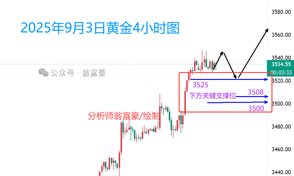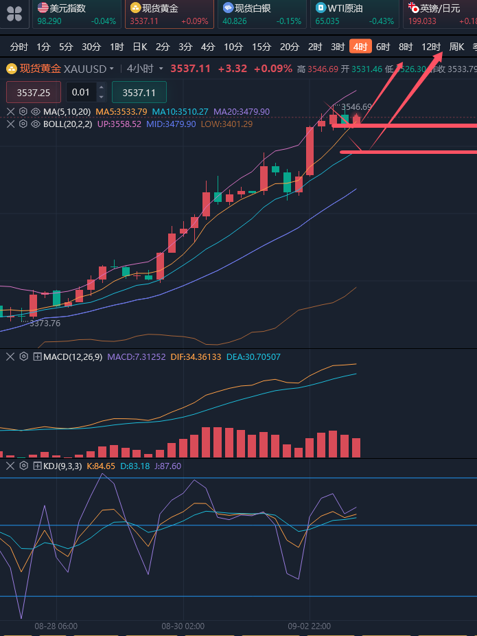 受地缘局势及美联储降息预期推动,黄金处于加速上涨阶段,日线自3311低点已大涨近250美元。本周五非农数据将影响月中美联储利率决议及降息路径,翁富豪提醒大家需重点关注。我们维持看涨观点(三角末端突破时已强调),但日内不宜追涨——近期均出现不同程度回调(如昨日最高3508跌至3470,幅度近40美元),当前价格高位波动加剧。技术上,第二关键位3540以上需警惕调整,后续潜在回落点看向3560及3585-3590区域;下方支撑关注3525、3508/3500,可择机布局多单。 操作建议:黄金建议3525附近做多,止损在3518,目标看向3540-3560 文章没有太多华丽的语言与鸡汤,一直如此,