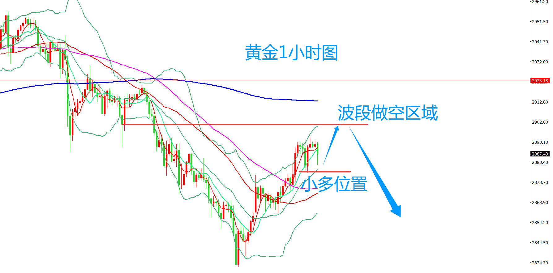 黄金分析: 黄金进入技术性调整,2955的下跌仅仅是阶段性调整,而非见顶,这个观点,前面已经讲过了,接下来,黄金到底会怎么走?昨天大幅反弹,金价最高冲击2895,跌的时候很迅猛,反弹的时候照样很唬人。昨天这个反弹,到底是什么性质?接下来到底是要做空还是做多? 首先,自上周五低点2832开始反弹,昨天算是反弹中继,一口气直接干到了2895,基本属于一步到位的走势。今天就很关键,能不能形成多空转折,就看今天。目前的反弹,属于4小时级别的反弹。日线空头未变。而周线方面虽然出现大阴向下,结构上单阴无法确定大方向的调整,日线BOLL收口后进入震荡行情,今天重点关注的支撑在2877顶底转换的位置。今天冲