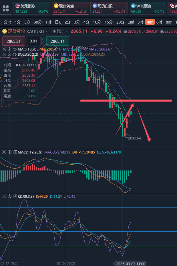 策略都是总结出来的,对症下药而不是照搬,我们做投资,看文章,不是看别人的操作建议,因为文章消息具滞后性、时效性,行情瞬息万变,很容易亏损的,我们看文章要做的是学习笔者子君当时对行情是怎么分析的,以便于我们学习这些分析思路,而不是盲目的根据建议做单,我们通过这种学习,我相信不久之后,你不用依赖别人,自己就会做单。 黄金消息面分析: 周一(3月3日)亚市早盘,现货黄金高开高走,一度上涨约17美元至2876.72美元/盎司,收复了上周五大部分跌幅,因乌克兰总统泽连斯基与美国总统特朗普会晤时发生争吵,打击了将很快达成和平协议结束俄乌战争的希望;市场对特朗普关税威胁的担忧也吸引逢低买盘支撑金价。当地时