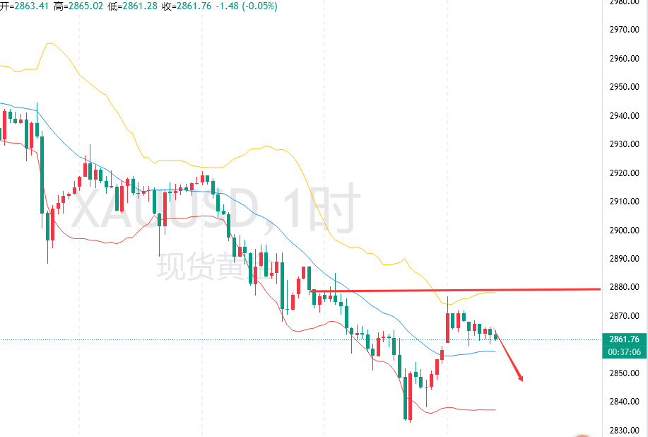 在黄金市场的波动中,我们需要关注黄金的走势动态,早间开盘黄金先延续隔夜的反弹,续涨急拉一波至2877一线,一根大阳线暂时稳住于中轨之上。随后,黄金一直运行于2876-2855的区间内整理。从欧盘开盘企稳2860产生的一根大阳形态来看,黄金有倾向于上破的迹象。如果美盘之前黄金能够拿下2877的早间高点,那么晚间还有可能会二次拉升,因此我们需要密切关注这些关键位置和时间点的变化,如果你目前黄金操作不理想,希望田浩洋能让你的投资少走弯路,欢迎前来沟通交流! 从4小时分析来看,上方短线阻力2883-87一线附近,日内反抽依托此位置继续先空下看回落,下方低点支撑关注2825-30附近,整体依托此区间保