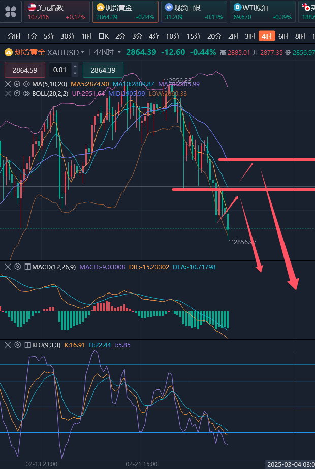 历史总是在不断重演,而技术分析本身就是一个寻找规律的过程,只要行情一旦形成规律,后面延续也将是大概率,所以只要规律找的好,不怕交易做不好,当你明白这个道理,你会发现原来交易真的是大道至简,而并没有想象中的那么复杂! ————————消息面 周五(2月28日)现货黄金低位徘徊,目前交投于2864美元/盎司附近。金价周四大跌1.3%,盘中一度创逾两周新低至2867.86美元/盎司,收报2876.95美元/盎司,一方面是美国耐用品订单数据强于市场预期,美联储降息预期进一步降温,美元大涨创一周新高,压制金价;另一方面,俄乌战争接近尾声,地缘局势担忧情绪有所降温,打压黄金的避险买需,尽管国际贸易局势担