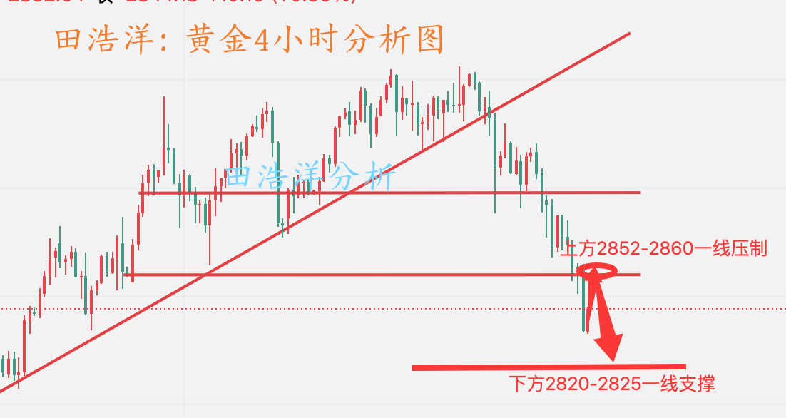 黄金空头趋势,这两天大家见识到了趋势的力量了吗,你是在等反弹,还是在一路抄底?我们这两天一直强调,黄金空头趋势,越弱说明黄金的趋势性越强,如果反弹太多,反而可能趋势就结束了,又转震荡了,黄金小时均线继续向下死叉空头排列发散,黄金不断创近期新低,黄金空头趋势明显,任何反弹都是给空的机会,黄金多头没有进行强有力的反击都是给空的机会,反而如果反弹过大,说明黄金多头开始反击了,那个时候要注意不要再一股脑的空了。黄金美盘反弹2852-60一线还是可以继续空。 黄金操作策略: 1、黄金反弹2852-2860一线空,止损2874,目标2820-25一线; 文/田浩洋——专业国际市场点评,针对实际市场参与者