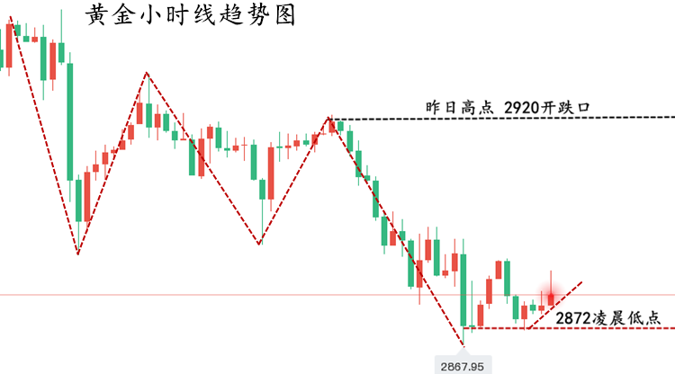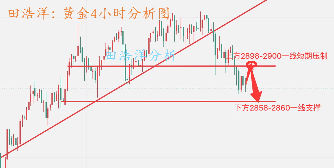 昨日黄金技术面在亚盘小幅反抽承压2920关口迎来压制回落震荡下行走跌,午后欧盘接连向下击穿2900整数关口并延续下行至2890附近呈现弱势震荡整理,晚间二次反抽承压2894关口迎来加速向下回落,最终空头击穿2870关口到达2867附近反抽弱势收盘,日K线报收压制回落破底中阴,短期金价见顶2950关口迎来连阴回落调整,如果你目前黄金操作不理想,希望田浩洋能让你的投资少走弯路,欢迎前来沟通交流! 今日上方短线阻力继续关注昨日小时线开跌口2890-95附近,日美反抽依托此位置继续主空顺势下看回落,下方目标位继续关注破底,短期空头弱势分界线2900整数关口,日线级别未突破并站上此位置之前任何反抽均是