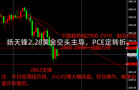 周四,避险情绪推动外汇市场对美元的避险需求, 现货黄金价格暴跌至逾两周以来最低水平。目前来看,黄金走势非常明显,这些短期波动和一些获利回吐只是周期的正常部分。 而美国将于周五公布1月份个人消费支出(PCE)物价指数。由于市场担心美联储可能更不愿意降息,若PCE数据与预估值有显著偏差,恐将引发负面反应。 昨日黄金操作回顾 早间第一单通知学员们在2917空,止盈在2908一线! 中午第二单通知学员们在2901多,遗憾止损在2895一线! 晚间第三单通知学员们在2888空,预期止盈2880一线,刚通知一部分2880止盈,就不到30秒,跌至2867一线!导致2880-2870止盈的都存在了! 对于今