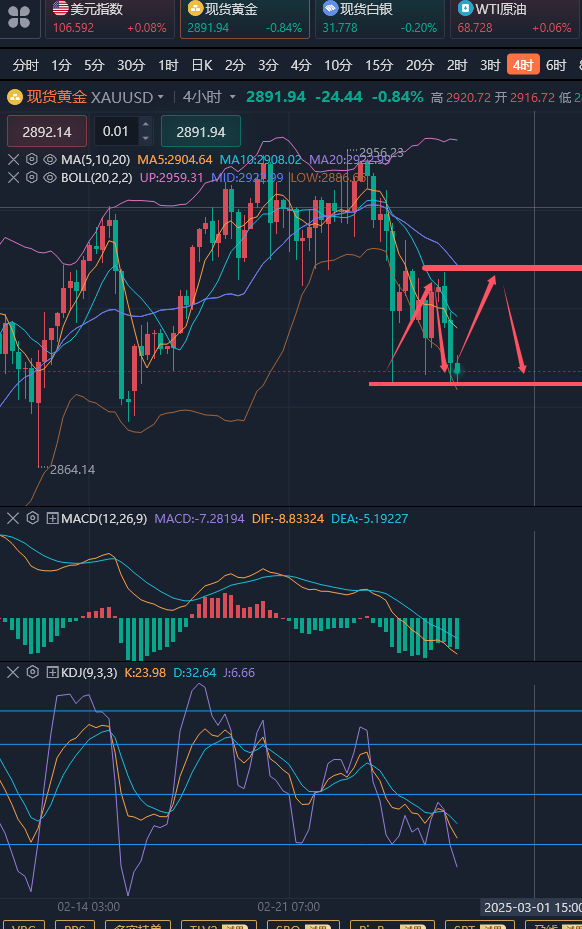 做投资最重要的两点:一是要懂得风险控制;二是要懂得分析行情,为什么风险控制放在第一位呢?很多朋友多会说投资风险大,其实笔者想说的是:投资本身没有风险,失控的投资才有风险。不要用你的侥幸去挑战行情,运气这东西是有,碰上一次别再去奢望第二次。学会止损,止损比止盈更重要,因为任何时候保本都是第一位的,盈利才是第二位的。 ————————消息面 周四(2月27日)现货黄金短线突然快速下滑,截至发稿暂报2892.15美元/盎司,跌幅0.83%,黄金价格周三收盘基本持平,美国总统特朗普表示,乌克兰总统泽连斯基将于周五前往华盛顿签署一项稀土矿产协议,俄乌外交官周四将在土耳其会谈,市场预期俄乌战争接近尾声,