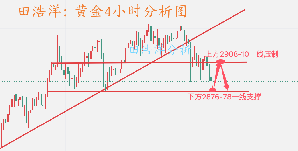黄金昨日再次迎来了大区间的震荡,早间快速反抽于2930一线后回撤,并且于美盘最低触及到2890附近后继续反抽,延续到早间最高到达了2920附近,而令市场以外的是,早间却再次连续回撤,截止目前黄金最低触及2876一线震荡,打破了近期新低,之前下跌突破点在2908一线目前成了上涨的阻力,晚间我们继续关注上方压制点,不破可以介入空单,如果你目前黄金操作不理想,希望田浩洋能让你的投资少走弯路,欢迎前来沟通交流! 从4小时分析来看,上方阻力在2908-10附近,下方短期支撑看2876-2878一线,中间位置一律多看少动谨慎追单,耐心等待关键点位进场。具体操作策略我会在盘中提示,及时关注。 黄金操作策略