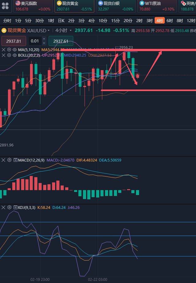 做交易最重要的是把握住黄金的主方向和节奏,才能作出正确的操作策略,这也是获利的前提和根本因素,不要因为一周有五天交易时间就非要每天去频繁的操作而没有掌握它真正的方向,这样还不如不操作。短线交易当中更需要思路清晰,把握好精准进场点位,一击而中避险被扫损。 ————————消息面 周二(2月25日)现货黄金短线下跌,截至目前报2935美元/盎司,跌幅0.58%,市场对于俄乌尽快达成停火协议的憧憬引发风险偏好情绪升温,加之部分投资者在金价昨日大涨后获利了结,金价因此出现回落。投资者将关注周五出炉的美国个人消费支出(PCE)物价指数,这是美联储首选的通胀指标。此外,本周至少有九位美联储决策者将发表讲