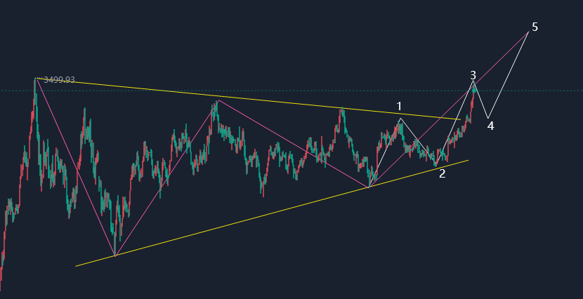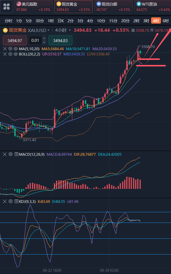 黄金大涨大跌就在这个星期,胆小的吃到肉了就赶紧跑,3500之上不要去追风险很大,那么如果说有低位高性价比的中线多,可以减一部分,再去上看3500上方。 昨天是美国劳动节,美盘提前休市,所以晚间整个波幅不大,但是日内打破了上周的周期循环,早间开盘小幅回落到3436—3437,亚盘就直接发力强势上升,午后最高到达3490一线,今早再接再厉,刺破3500,一度触及3508。 那么这一次黄金大涨主要受两方面因素影响:一个是之前鲍威尔讲话明确美联储九月降息信号;另一方面,是周五的PCE数据符合预期,和前值一致,意味着通胀没有升高,市场对美储降息预期再增强。 但是今天不建议高位去追,要么等回调看多,支撑