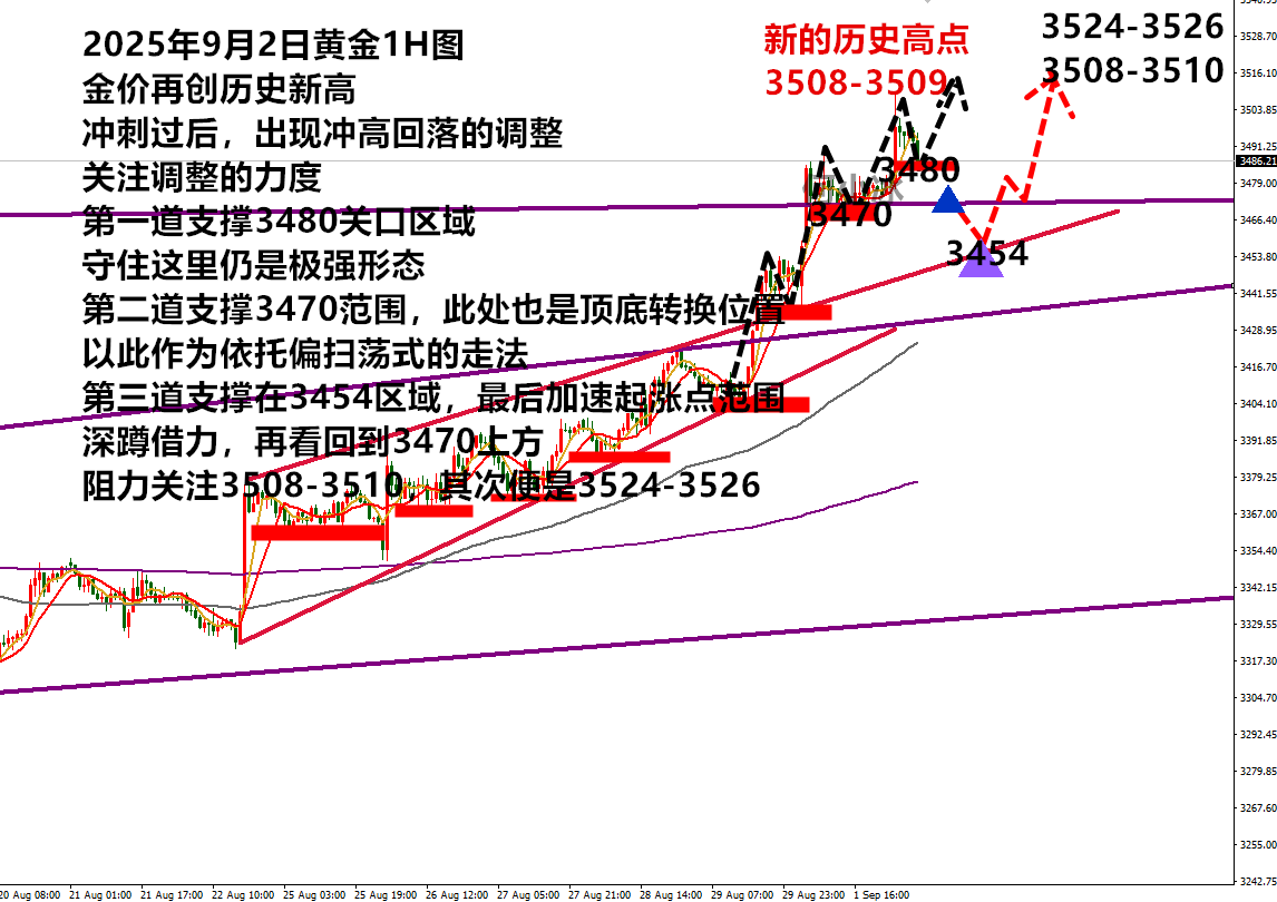 历史总是在不断重演,而技术分析本身就是一个寻找规律的过程,只要行情一旦形成规律,后面延续也将是大概率,所以只要规律找的好,不怕交易做不好,当你明白这个道理,你会发现原来交易真的是大道至简,而并没有想象中的那么复杂! ————————消息面 周二(9月2日)黄金延续前五日涨势,突破每盎司3500美元历史高位区域,最高触及3508.46美元/盎司,涨幅约0.93%,不过,因部分多头获利了结,金价突破3500后快速回落近20美元,目前交投于3495美元/盎司附近。龚关铭认为,买盘压力依然坚挺,央行黄金储备相较于美国国债的重要性日益提升,这强化了黄金作为全球最稳健避险资产的地位。只要储备需求持续且低