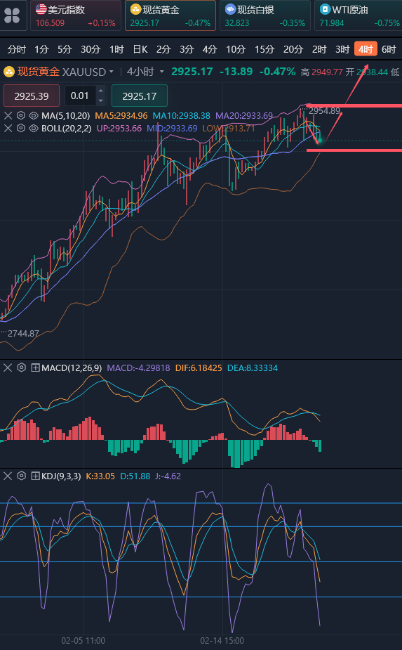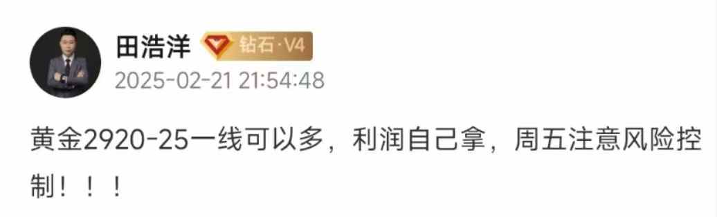 方向对了不怕路远,用时间见证实力,用实力赢得未来,让信任成为利润,用利润解除疑惑。市场瞬息万变,顺势而为,才是王道,趋势来了就是干,不要逆势抄底,免得难受煎熬。交易切记不要意气用事,市场专治各种不服,所以一定不要扛单,相信很多人都深有体会,越抗越慌,浮亏不断放大,搞的吃不好睡不好,还白白错过很多机会,如果你也有这些烦恼,那不妨跟上田浩洋的节奏来试试,看看能否让你豁然开朗。 黄金周五和周三周四我们预期的一样,都是等待技术面回调再多,周五我们也是给出了回踩2918-20一线多,2925一线做多,相信关注我的朋友和实盘都是可以看得到,近期本人都一直强调回踩做多,高位不追多的口号,黄金冲高