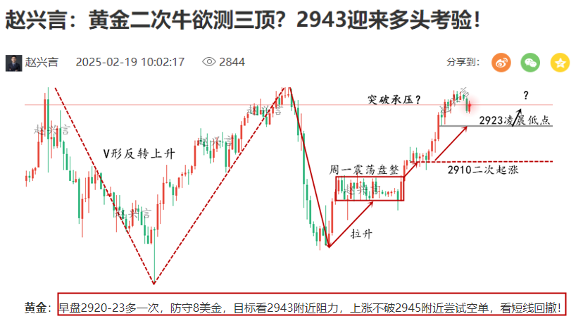 黄金再度逼近2942高点附近,或将再创新高冲击3000关口,今天2月19号周三,我们来看一下黄金。 黄金前面在2942高点双顶压制短暂下跌,走了一小波回调修正,昨日就再度上升价格逼近2940,今日早间开盘到午后一直在高位横盘,行情走到这里是形成三顶顶部形态,还是要冲击3000关口? 从技术面来说,多头行情中的强势多遇阻,一般会多次测试并形成破位上升的行情,压制下跌的幅度并不会太大,所以多头趋势行情阻力就是用来破位的,顺势看多远比逆势空赢的概率面大。 如果在2942附近看三顶顶部形态,一般价格触及后就会形成快速下跌,收一根长上影线,符合这个形态才可以看顶。而现在