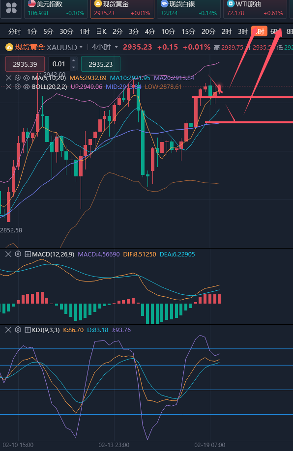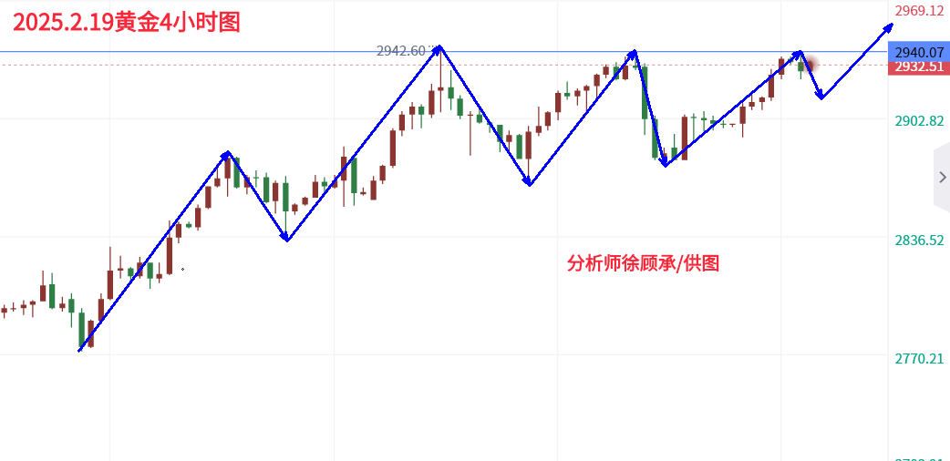 投资犹如下棋,棋艺高者能看出五步,七步甚至十几步,而棋艺低者只能看出两三步,高者顾大局,谋大势,不以一子一地为重,以最终赢棋为目标,低者则寸土必争,只为争一时之需,结果频频受困。所以看趋势,一定要有长远眼光,目光所致,便是你所能拿到的利润,你只能看到的只有眼前5个点,那你便只能拿到5个点的利润,你能看到100个点,那么你能拿到的就是100个点的利润。 ————————消息面 周三(2月19日)现货黄金延续上涨趋势,稳定在历史高位附近,目前交投于于2930美元上方,美国总统特朗普发出新的关税威胁,以及地缘政治不确定性加剧,推动避险需求,本周将等待黄金价格进一步刷新历史高点。市场还关注美俄官员在