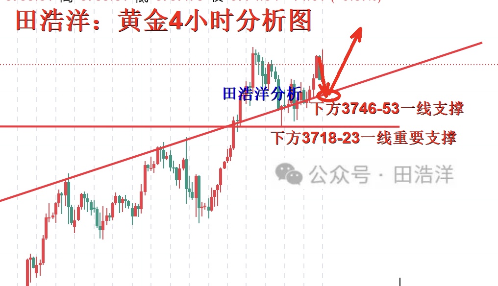 黄金开盘3758一线继续冲高,多头如周末做分析的那样强势,目前已经突破3800一线甚至站上此位置,多头一直是本人田浩洋近期分析的趋势,而且多次进行回踩做多的操作策略,相信关注我的朋友都是可以看到,今天开盘至目前黄金的表现可以说明本周国庆假期的不平凡,黄金依旧在酝酿反弹势头,所以大家尽量不要做空,回踩主多事关键,把握好的做多进场,这样才能顺势而为拿住利润。短期多头的情绪仍然处于高涨的状态之中,操作上以回踩继续做多为主,如果你目前操作不理想,希望田浩洋能让你的投资少走弯路,欢迎前来沟通交流! 从4小时分析来看,下方短期支撑关注3776-84一线,重要支撑则维持于3718-23附近多空分水岭区域,