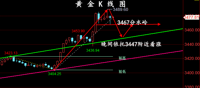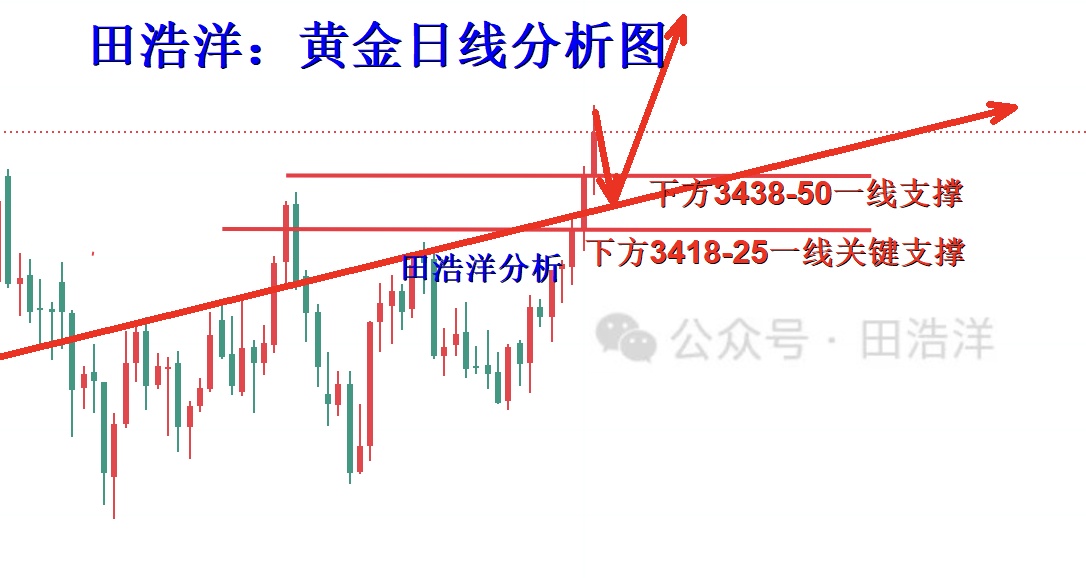 黄金今天开盘3438一线,然后开始震荡回踩蓄势,最低触及3437一线后开始反弹,截止目前多头最高触及3490一线回踩,早间开盘我们在3448附近做了一个短空,在3438一线获利出局,计划在3430-35一线做多,但是行情没有给机会进场,最低到了3436一线就反弹拉升了,遗憾错过一直看好的多头,黄金目前依旧是多头趋势,下方我们关注3438-50一线的支撑,回踩继续做多为主。如果你目前操作不理想,希望田浩洋能让你的投资少走弯路,欢迎前来沟通交流! 从日线分析来看,下方支撑继续关注3438-50一线附近,日内回踩依托此位置继续主多顺势看涨不变,短期多头强势分界线3418-25一线关口,日线级别企稳