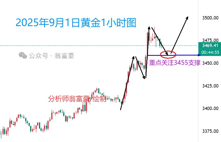 黄金今日早盘短暂调整后便强势拉升,呈现单边上扬态势,充分展现多头坚定决心,当前强势格局下大概率将突破3500整数关口。技术面显示,黄金1小时周期均线维持金叉向上发散的多头排列形态,上涨动能持续强劲,价格势如破竹,随时可能突破上行——强势行情往往不回调,若出现深度回调反而会削弱多头力量。短线来看,早盘突破高点后回踩3455一线若获支撑,价格有望继续扶摇直上,因此翁富豪建议重点关注3455上方支撑区域,可逢低布局多单。尽管当前黄金涨势诱人,但越是在关键突破前夕越需保持理性,冲动交易易引发风险。值得注意的是,随着价格逼近历史高位,前期高位套牢盘可能择机离场,这将增加短期波动不确定性。建议大家耐心等