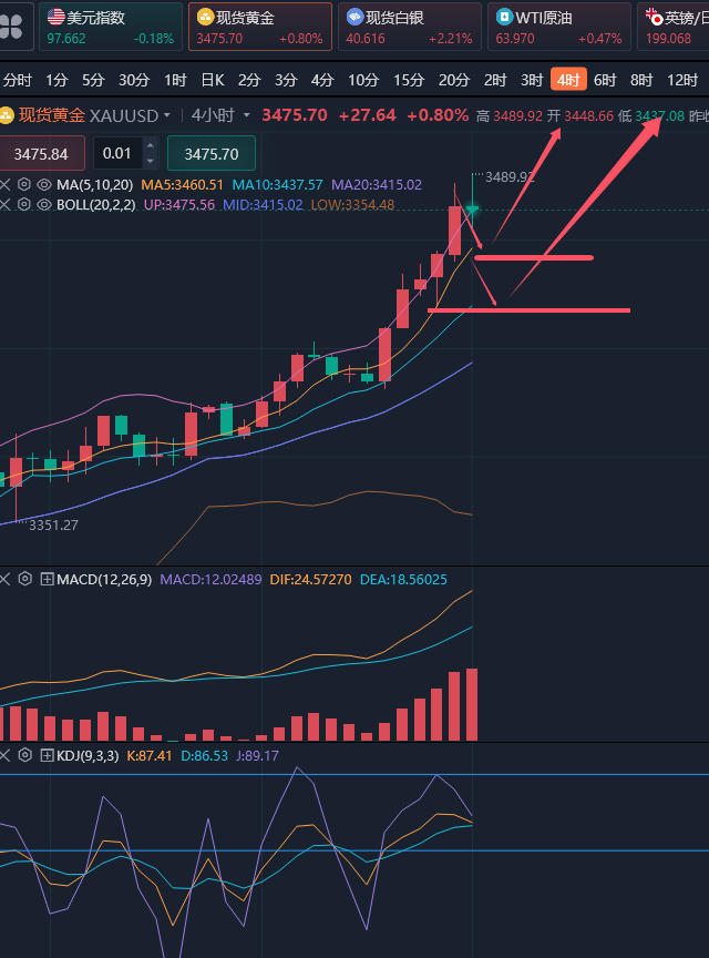 市场从来都是多空的零和博弈。无论你在其他方面如何成功,到了市场里,赢输就是唯一标准。最近许多投资者都在问黄金原油亏损了怎么办?怎么回本?其实有这种担忧是正常的,毕竟只要是投资就一定会有风险。而面对这种亏损风险,大多数的投资者的心里都会慌乱,那么兴言这里就是你的明灯所在! 对于今天黄金走势的看法! 黄金再度旱地拔葱,一度上涨至3490一线,本周一的行情再度引爆市场多头,那么当前在黄金已经逼近历史高位的情况之下,我们的策略就需要重新调整,在当前已经是高位的情况之下,欧盘需要密切注意3500这个位置的关键得失,若突破则还有新高,反之那么就可以短空看一个回撤再做多! 4小时频频收阳,但临近上方349