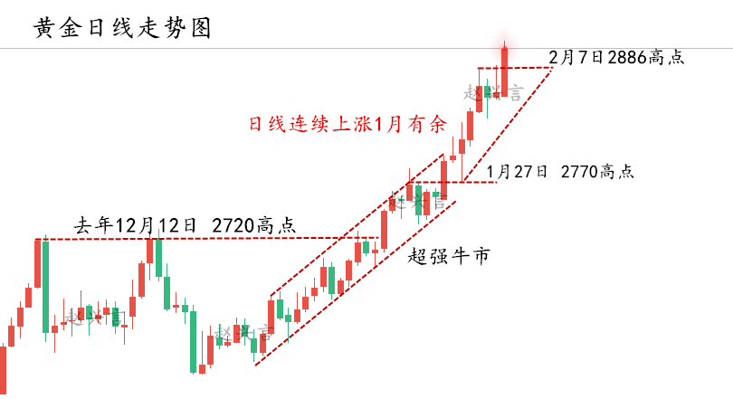今天2月11号周二,黄金昨日再创新高强势站上2900,从早间开盘就直接开启上升模式,整个亚欧盘一涨再涨,晚间高位震荡收盘在2900之上,那么2900上方空间还有多大?什么时候走回调修正? 一般来说在多头行情末期,会走加速上涨出现逼空行情,这种走势往往不带回调,多头放量出尽之后就伴随着冲高回落,走回调修正,只不过是回调幅度的大小问题。 昨日和今早的行情就符合这种特点,早间冲高回落最高触及2942,距离3000关口也只有不到60美金。 从2583—2942涨幅高达359美金,到3000关口就是417美金的涨幅,一轮多头行情走个三四百美金基本是极限了,回调只是时间问