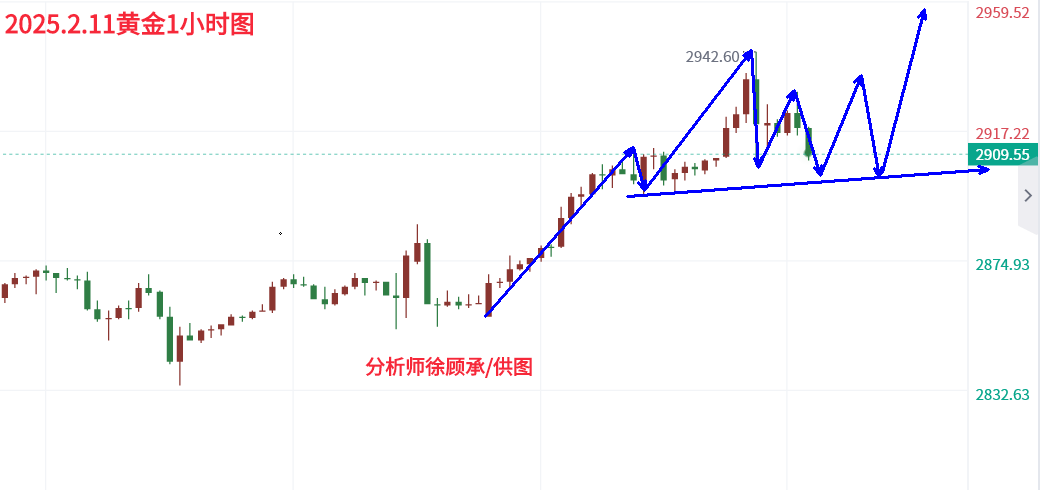 【黄金消息面分析】:现货黄金在周二(2月11日)亚洲交易时段攀升至每盎司2942.70 美元 的历史新高,延续了过去16个月的上升趋势。 【黄金技术面分析】:今日开盘后一路猛涨再次冲击和突破历史新高到达了2942一线,而后开始修复回调目前实时报价2920附近,黄金延续了了今年涨势从今年的低点到现在的高点涨幅将近330个点,涨幅达到了110%,这是不正常的.从目前的盘面来看一小时布林带上轨2928-2930形成了短暂的阻力,但是美指的下跌会给黄金的上涨提供一定的支持加上大量的人员大力购买黄金,推动金价的上涨.支撑方面暂时参考今日开盘点位和今日低点2908-2905区间.整体而言还是多头占据了市