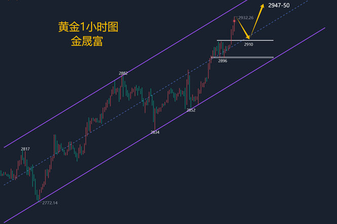 黄金自昨日2856价位起,在技术面和消息面的双重驱动下,涨势如虹。全球经济的不稳定性成为金价攀升的重要推手。昨日晚间,金价一度冲至2911高位,虽有短暂回调至2896,但整体上涨趋势不改。 我们自昨日欧盘起便调整策略,顺势做多,收获颇丰。今晨开盘,金价继续在2908附近徘徊,随后再度发力,最高触及2932。当前市场上方阻力位在2945-2950区间,一旦金价站稳2950,或将直逼3000大关。而下方的强支撑则位于2911-2903区间。面对如此市场格局,建议投资者日内操作以顺势做多为主,同时也不忘反弹高空的机会。在操作过程中,需密切关注市场动态和技术信号,灵活调整策略。 操作策略1:建议回调