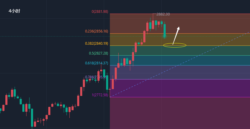 黄金今天我们就强调黄金抗跌,回踩就是给机会做多,也告诉和通知大家2850附近做多,下午黄金最低触及2848一线反弹,多单也就顺理成章获利,文章也直接公开提示2850继续多,黄金还是多头趋势,虽然回落的多了一点,不过不改黄金多头趋势,黄金回落继续做多。黄金小时下探踩均线之后继续上涨,黄金现在多头还是更胜一筹,趋势依旧不变,回落就是继续给做多的机会。如果你目前黄金操作不理想,希望田浩洋能让你的投资少走弯路,欢迎前来沟通交流! 从4小时分析来看,下方关注2844-2852一线短期支撑,回踩继续先多看涨不变,上方短线阻力关注2878-80附近,整体依托此区间保持回踩做多循环参与主基调不变。具体操作策
