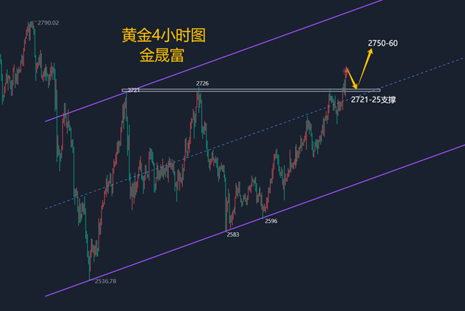 【技术分析】 现货黄金天图,昨天行情再度获得足够动能强势拉升,并且突破了关键高点压制,多头格局相当明显,后市有望继续向上拉升走强,目标位置先看 2789.3 一带。 现货黄金 4 小时图,市场多头流向延续性强势,虽然中间有过较为极端的回调但也是依托趋势线支撑一路向上运行,如有多单可以持有,空仓的话只能耐心等待短期合理入场形态。 现货黄金小时图,这波多头拉升前也是凭借 15EMA 支撑而企稳向上,符合技术形态要求,市场多头流向保持完好,后市继续凭借趋势线和均线支撑关注合理的多头机会。 【交易思路】 多头格局明显,等待行情在小时级别进行必要充分调整,凭借趋势线和均线支