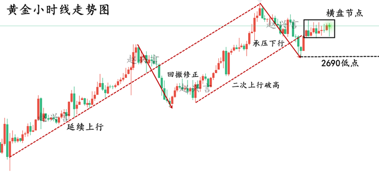 特朗普在当地时间20日顺利宣誓就职,较为意外的是,特朗普宣誓就职时没有提及立即加征关税,全球乐观情绪抬升,黄金和美元双双走软。 但暂时不加,不意味着一直不加,就职仪式结束后,特朗普随即宣称他正考虑对加拿大和墨西哥加征关税,加元和墨西哥比索立刻大幅下跌。美元指数和金价反弹。 特朗普当选的通胀预期依然存在,美联储的利率走向也一直有转向鹰派的倾向。但当前左右市场的依然是新****政策带来的不确定性,避险或是黄金近期交易的主要逻辑。 日图看金价在此前连续上涨后进入到横盘震荡,但震荡过程中价格重心并未下移。小时图在前三个交易日走出了矩形整理形态,虽然在昨日受基本面影响一度跌破区间下轨,