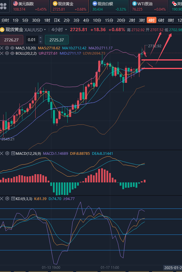 一夜暴富,这个充满诱惑的字眼,常常与彩票中奖、股市奇迹等故事相连。它像是一场突如其来的风暴,让人措手不及,也让人心生向往。但我们必须清醒地认识到,这样的幸运毕竟属于极少数人,它更像是生命中的流星,绚烂而短暂。相比之下,真正的富足,是心灵的充实与物质的稳健增长,是通过持续不断的努力,逐步积累起来的财富与智慧。这种富足,虽然来得慢一些,却更加坚实可靠,能够伴随我们走过人生的风风雨雨。 ————————消息面 周二(1月21日)现货黄金大幅反弹,目前交投于2726附近,延续了前一日自2689美元区域反弹后的上涨势头,并在周二(1月21日)触及自去年11月6日以来的最高水平,约为2732美元。这一上