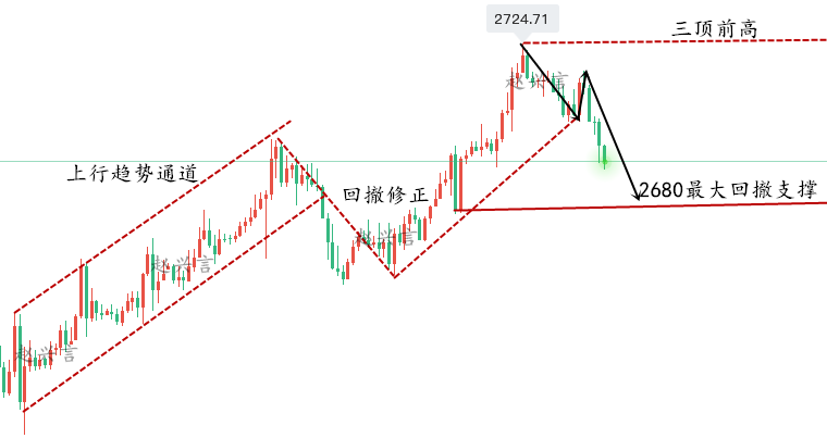 上周黄金市场延续前两周的拉升过程,周初开盘在2690.6的位置后行情先回落,周线最低给到了2656.5的位置后行情受到周线级别五日均线和基本面避险因素影响行情震荡拉升,到周四周线最高触及到了2724.8的位置后行情承压整理,周线最终收线在了2703的位置后。周线以一根下影线长于上影线的高位纺锤形态收线,而这样的形态收尾后,今日先拉升2712空,保守2714空止损2718,目标看2700和2692-2685附近 白银市场上周开盘在30.408的位置后行情先回落,周线最低给到了29.474的位置后行情强势拉升,周线最高触及到了30.971的位置后行情承压整理,周线最终收线在了30.323的位