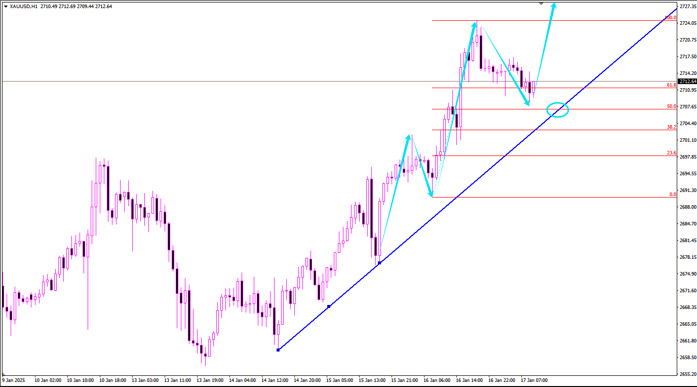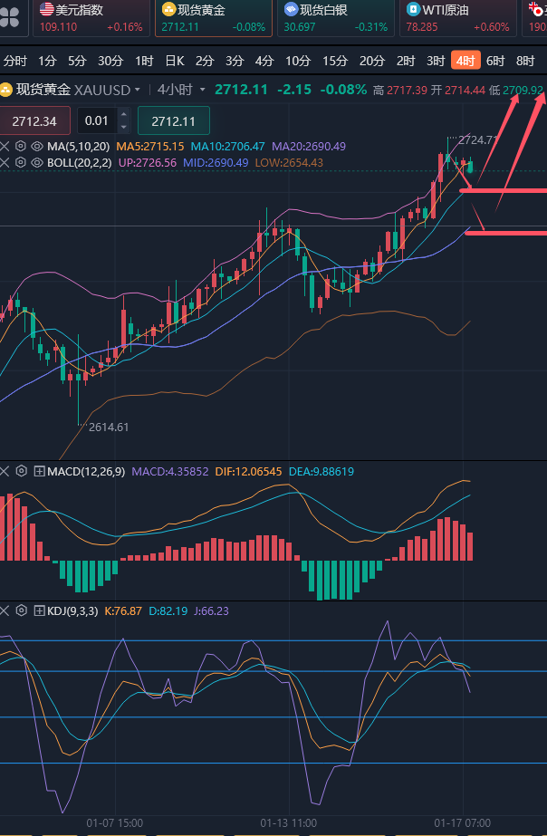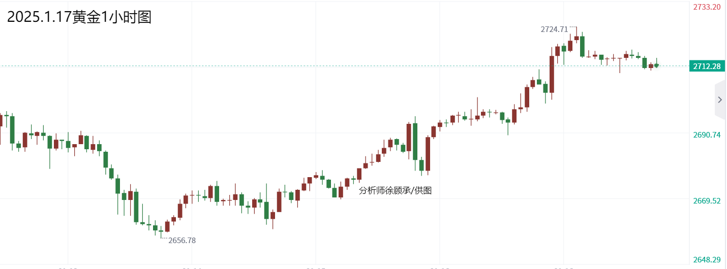 做单我们要有“落袋为安”的心态,而不是一味盲目追求最大利润。我们能做的是要把握住自己能赚的那部分利润。我们在这个市场是来赚钱,而不是来扛单的。赚钱了,该出的就出;到止损点,该割的就要割。这样才能把风险降到最低。不怕做错单,就怕一根筋到底和裹足不前。大胆操作,谨慎控制,获利自然水到渠成。 ————————消息面 周五(1月17日)现货黄金窄幅震荡,目前交投于2713.55美元/盎司附近。金价周四升至一个多月高点,盘中最高曾触及2724.61美元/盎司,距离12月12日触及的逾两个月高点2726.05不远,收报2714.49美元/盎司,为连续第三个交易日上涨,因最新的美国经济数据进一步压低美债收