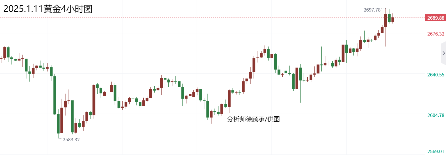 文/徐顾承: 1月10日周五现货黄金市场经历了一场跌宕起伏的行情。美国非农报告揭晓后,金价瞬间遭受重压,一度暴跌至2663美元/盎司附近,市场氛围骤然紧张。令人意想不到的是,金价随后迅速扭转乾坤,犹如浴火重生,飙升至逼近2698美元/盎司的高位。 数据显示去年12月美国新增就业人数高达25.6万人,远超市场预期的16万人,创下9个月以来的新高;同时失业率也低于预测值,降至4.1%。徐顾承认为尽管非农数据利空,但金价却展现出顽强的生命力,最终收盘大涨19.94美元,日内涨幅达到0.74%,收盘2689.71美元/盎司,为市场参与者留下深刻印象。 黄金:日线图上再度以阳线报收,形成了四连阳的强势