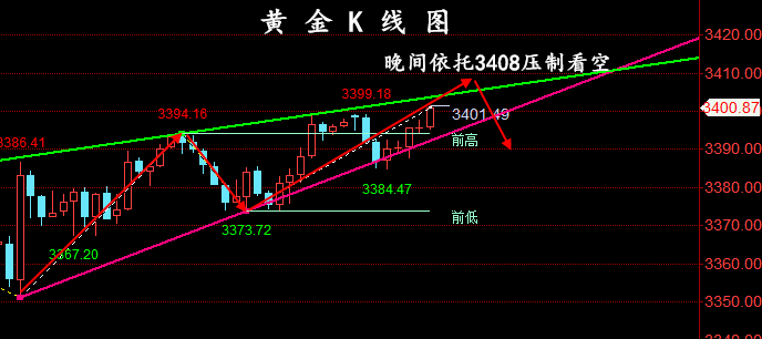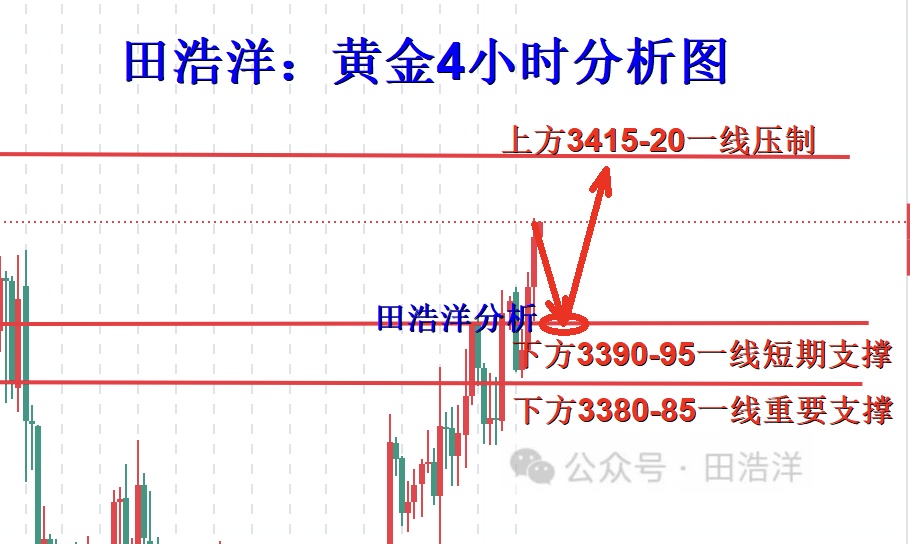 今天我们早盘就强调了冲破3400一线是迟早的事,晚上就已经实现了,午夜冲击3315-20一线概率还是比较大的;支撑由早间3383一线已有所上移至3390-93一线,要保持震荡式逼空上拉,就必须守住中轨3390-95一线,若守不住就转为震荡看3380-83一线,因此回踩3390-3395一线支撑考虑继续看涨,目标看晚间3415-20一线,如果你目前操作不理想,希望田浩洋能让你的投资少走弯路,欢迎前来沟通交流! 从4小时分析来看,午夜下方短期支撑关注3390-95附近,重点关注3380-83一线支撑,日内回踩依托此位置继续主多顺势看涨不变,短期多头强势分界线关注3370关口,日线级别只要企稳此位