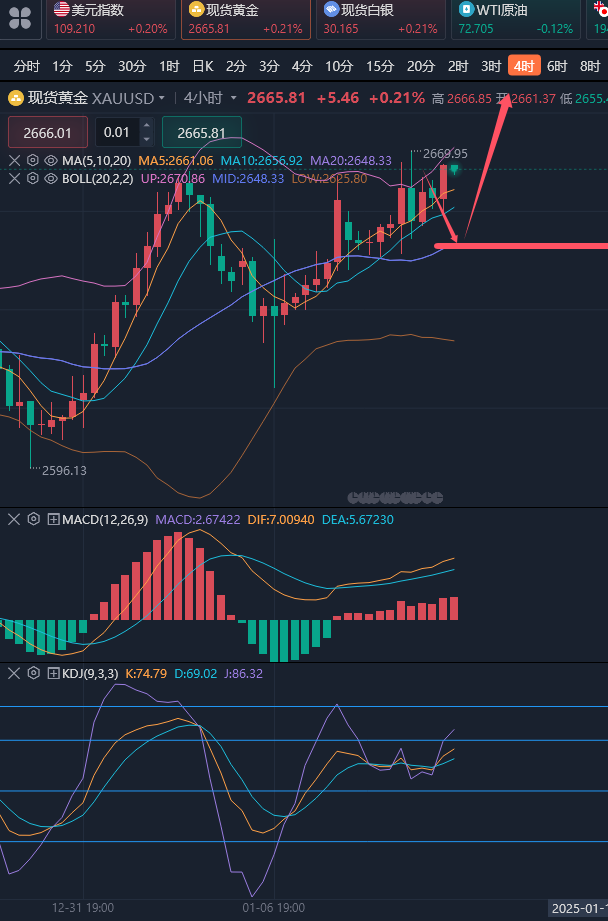 没有一条路走到黑的行情,更没有一直亏损的投资,行情反反复复,操作亏亏赚赚,没人赚的彻底,都是摸滚打爬,稳稳当当,步步为营的结果。在这个良莠不齐的市场,亏损的人不少,但是或多或少都存在交易中的大问题,无论是心态不好,还是犹豫不决,还是不带止损,总之亏损不是偶然,总会有大问题存在,做投资不是一朝一夕,唯有摒弃这些坏毛病,孜孜不倦的学习,掌控风险,稳健操作,必然是你涅槃重生的时候。 ————————消息面 周四(1月9日)现货黄金高位窄幅震荡,目前交投于2665美元/盎司。金价周三触及近四周最高2669.83美元/盎司,此前一份弱于预期的12月民间就业报告让一些市场参与者松了一口气,认为美联储在今