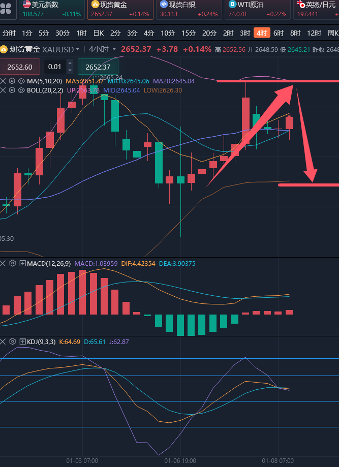 一般情况下,投资者在进场之前就要设定止损点,并在实际情况与止损原则相符时立即执行,切忌抱着侥幸心理,以各种借口拖延止损,这样只会造成亏损继续扩大。因此,投资者执行止损时应坚持少思考、多行动,以免思考过多做出错误判断。要知道,止损信号的发出不是投资者自己想出来的,是客观事实的表现,那么,坚定执行就对了。 ————————消息面 周三(1月8日)现货黄金窄幅震荡,目前交投于2652美元/盎司附近,因为特朗普政策的不确定性和地缘局势动荡,金价周二盘中一度涨至2664.15美元/盎司附近,接近上周五创下的近三周新高,但由于美国服务业数据表现强劲,职位空缺增加,表明美联储大幅降息的可能性减小,美元指数