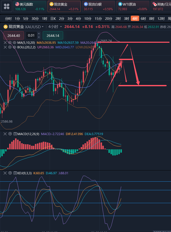 今天1月7号周二,我们来看一下黄金,黄金昨日走势基本符合预期。 早间反弹压制在2650下方走跌破低,欧盘在2630一线连阳上升,晚间多空洗盘深度探底回升一度测试2614,最后收盘在2630上方。 整体转为震荡行情,多空延续性较差,一定要注意风险控制。 交易方面,昨天黄金行情符合锦晟周末分析布局,整体走势基本在意料之中,日内围绕2630一线多单,成功止盈2645,利润都在15美金+。早间下跌没有参与,美盘观望看戏,这两波虽然有一定的利润空间,但是行情走势看不懂。 想抓住所有的波段不现实,交易只做自己认知范围内的行情,未知和不确定意味着风险,不激进参与,有