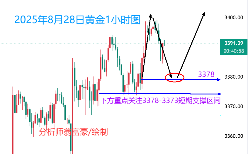 张尧浠:金价看涨前景加强、周尾留意数据短线调整风险 上交易日周三(8月27日):国际黄金先跌后反弹,随着美联储独立性危机加剧和触及日内支撑的再度看涨入场,多头再度发力最终垂线收涨,维持着近期的反弹趋势和多头动力,虽然ZZ指标显示触顶,但下方均线支撑众多,近几个月的走势前景依然处于看涨形态,故此,操作上,仍还是保持低多看涨不变,等待阻力的突破,和刷新历史新高。 具体走势上,金价自亚市 开于3393.50美元/盎司 ,先行走低,于午间及欧盘时段触及 日内低点3373.48美元 ,并维持在此上方进行12美元左右的区间震荡,到美盘时段,多头力量再度加大,连续反弹回升,并转强,录得 日内高点3398.
