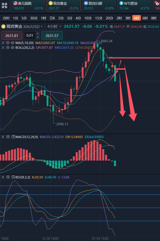 投资的首要原则是规避好风险,如果不能规避风险,那么赚再多的钱,有一天还是会回去,任何一个人成功都有其方法,而投资交易也必有其原则,积少成多,以小损失博大是交易的根本,而有很多人却忘记了初衷,把利益放在眼前,把风险挂在墙上,很多人不知道,个人在这个市场非常脆弱,非常渺小,若不懂得规避风险,就像航行在大海的一只小船,随时会被风浪打翻。 ————————消息面 周一(1月6日)现货黄金小幅下跌,目前交投于2633美元/盎司附近,正好在布林线中轨附近。金价上周五从三周高位回落,收报2639.62美元/盎司,跌幅约0.69%,美国1月ISM制造业PMI数据强于市场预期,美债收益率走强,令金价承压,同时