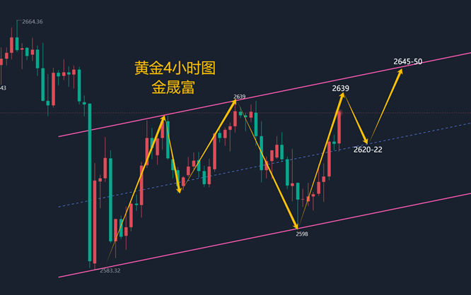 如盈财女:1.2黄金原油维持偏强,回踩继续多 新年新气象,市场静待特朗普二度上任,美元指数持续走高,表明市场看好新政策对美元的利好支撑,但是国际局势不稳定加上新年需求支撑,黄金表现跟美元同涨的格局,2024年最后一个交易日二次回踩2602附近没能再破低点,震荡之后选择向上回收,早盘开盘延续偏强震荡格局向上,操作上回踩多为主 黄金周一下跌中,看似很弱,但实际没有向下破位走低,H4周期的表现也很明显,目前布林收口,k线在布林中轨之上,所以,现在黄金是震荡强势,上涨至少要看到2640前期高点,所以,本周四,周五在强势之下,先看2640得失,如果2640破位,拉开布林,则会带动市场多头来一波小高潮至