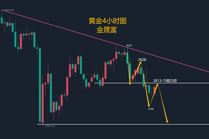 黄金昨晚触底2596一线,我们也公开实盘圈给了2598-2600一线多,今早2610附近获利出局,午夜文章也给了反弹2610-12一线做空,现在还是空头趋势,早盘反弹就是继续给空的机会,黄金小时均线再次继续死叉向下的空头排列,而且黄金下跌不断刷新低点,现在黄金明显还是空头趋势,继续顺势空就是了,黄金昨晚美盘反弹承压2622继续下跌然后创新低,黄金短线反弹2610附近就受到了压制,上方我们关注2610-2612一线短期压制,空头下方也依旧还有空间,如果你黄金操作上比较迷茫,可以找到我,希望田浩洋能让你的投资少走弯路,欢迎前来沟通交流! 从4小时分析来看,黄金短期关注2610-2612一线短期压