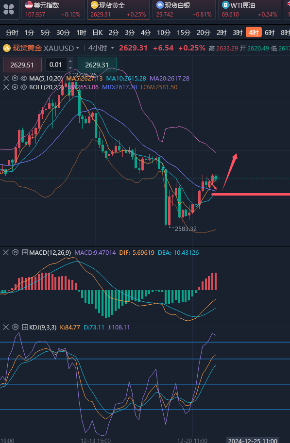做交易要做到,开仓有把握,建仓有着落,持仓有风控,平仓有利润。宁可明明白白放弃,不可稀里糊涂错过!复杂的行情简单做,简单的行情重复做,为什么我们总是在纠结行情本身,而忘了我们的目的不过是找准机会赚一笔钱,踏入市场那一刻请大家记住,无论行情如何变化,重要的是我们能做的有哪些,笔者的文章每天坚持更新中,没有百万盈利刺激你眼球,只不过是让你按着我的分析节奏赚上五六个点,公道自在人心,能不能赚钱不是我说了算,就让行情去证明谁才是市场的常青树。 ————————消息面 周一(12月23日)现货黄金窄幅震荡,目前交投于2629美元/盎司附近。金价上周五大涨近30美元,受美元和美债收益率走软支撑,此前美国