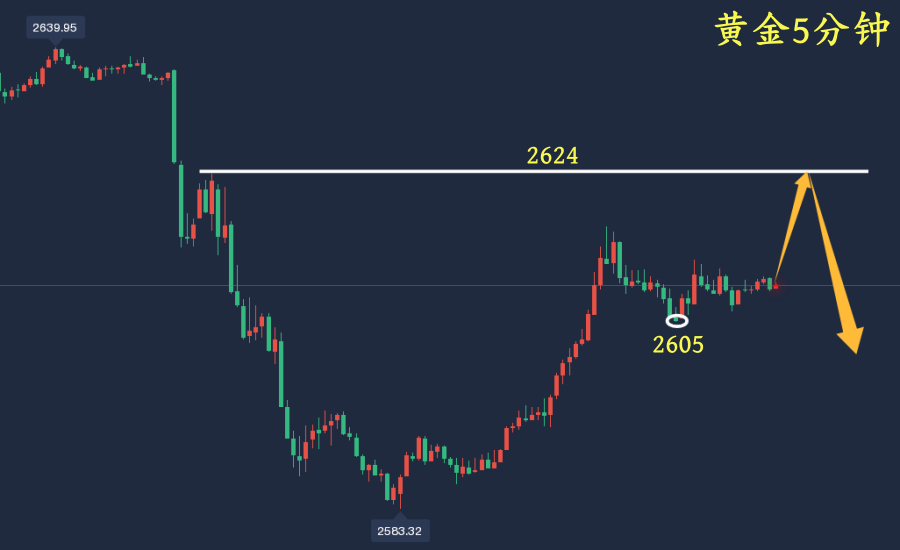 【黄金消息面分析】:周五(12月20日)亚市早盘,现货黄金窄幅震荡,目前交投于2593.38美元/盎司附近。金价周四反弹受阻后回落,盘中早些时候一度升至2626.33美元/盎司附近,但收盘回落至2600关口下方,收报2594.28美元/盎司,美国数据强化了市场对美联储未来一年将采取谨慎宽松政策的预期,美元指数和美国十年期国债收益率继续冲高,对金价形成压制。 【黄金技术面分析】:目前一小时盘面连续下跌形态明显,阶梯式的下跌使得金价每次反弹的高点都无法突破起跌点,在大方向的引领下,黄金反弹能量越来越弱,进一步下跌的可能也逐步放大,后市将主要参考2622均线压力位下方放空!黄金1小时均线还是空头向