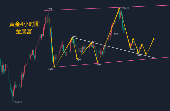 昨夜低点给到2632一线止跌反弹,周三早盘黄金现报价2650一线。现在1小时Z字转向指标见顶,短期内上方的阻力看1小时布林带上轨2655位置,同时4小时布林带中轨也是位于2655,那么这里就可当做是今日的多空分界线对待。目前4小时SAR指标完成顶底转换出现在底部向上发散,那么再次破低的概率不大,今日有望提前完成筑底迎接下半周的反弹行情。 技术面来看4小时布林带上轨位于2679,中轨2655,下轨2632,日内计划初次触及2654-56区域正常做一次短空回补缺口,后面看回撤力度再做多看涨2655破位。今日阻力关注2655,其次是2664,破位看2672和2680两个节点。支撑留意1小时SAR指