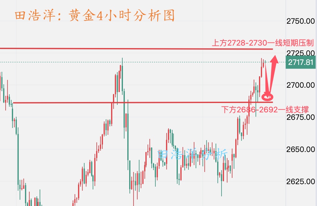 【黄金消息面分析】:现货黄金在前一日突破一个月高点后,周四小幅回落至2712.50美元/盎司。市场分析认为,近期黄金的涨势主要受到以下因素驱动:地缘政治风险上升、中国重启黄金储备购买、以及市场对美联储降息的高度预期。 【黄金技术面分析】:技术层面上来看,黄金日线级别已经突破收敛压力,这里基本确认突破有效,但MACD只是反弹,并不是反转,且前期高点附近存在很大的压力。若基本面没有进一步的变化,则金价存在回踩的可能性,短期不宜过分追涨,日线级别压力2800美元整数关,下方支撑2710美元附近。4小时级别上来看,目前均线偏离值有点大,而MACD上涨动能衰竭,存在调整的需求,短期等待回踩为主,若MA