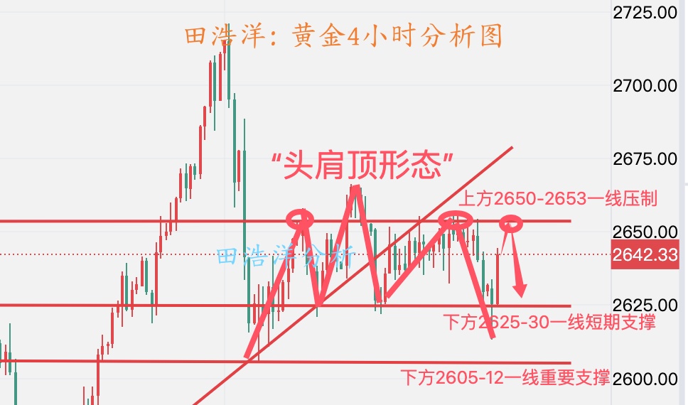方向对了不怕路远,用时间见证实力,用实力赢得未来,让信任成为利润,用利润解除疑惑。市场瞬息万变,顺势而为,才是王道,趋势来了就是干,不要逆势抄底,免得难受煎熬。交易切记不要意气用事,市场专治各种不服,所以一定不要扛单,相信很多人都深有体会,越抗越慌,浮亏不断放大,搞的吃不好睡不好,还白白错过很多机会,如果你也有这些烦恼,那不妨跟上田浩洋的节奏来试试,看看能否让你豁然开朗。 黄金周五空头大杀四方,周五早盘开盘直接从2633一线回落至2613一线后开启反弹,白天基本上震荡2635-43一线,晚上非农数据利空,黄金也是小反弹后直接跌至2626一线,对于非农来讲,周五早上先跌后涨已经消耗了市场的动能