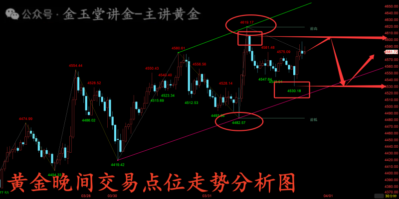 黄金今天早上成功表演一波走空,随后一波触底反弹,等行情把上下高低点都触及一遍后便彻底失去了动力开始了小幅度的震荡,所以其实今天白天我们短线能操作的空间也都不大,更多的也还是在等机会! 其实本周黄金由于耶稣受难日加之周五非农即将公布的影响,市场前几日波动都不会太大,所以我们短线操作上主要还是等合适的点位去进行把握,也尽量不要在关键高低点去追单,毕竟现阶段短线行情的延续力度都有限,哪怕突破了上方关键压制,也只能先延续看30-50个点看到另一个高点压制就行,具体行情的实时交易点位文章不好及时更新,详细我都会及时通知每一位实盘客户的。 当前晚间短线交易点位分析: 1、晚间金价如果再度二次试探上方45