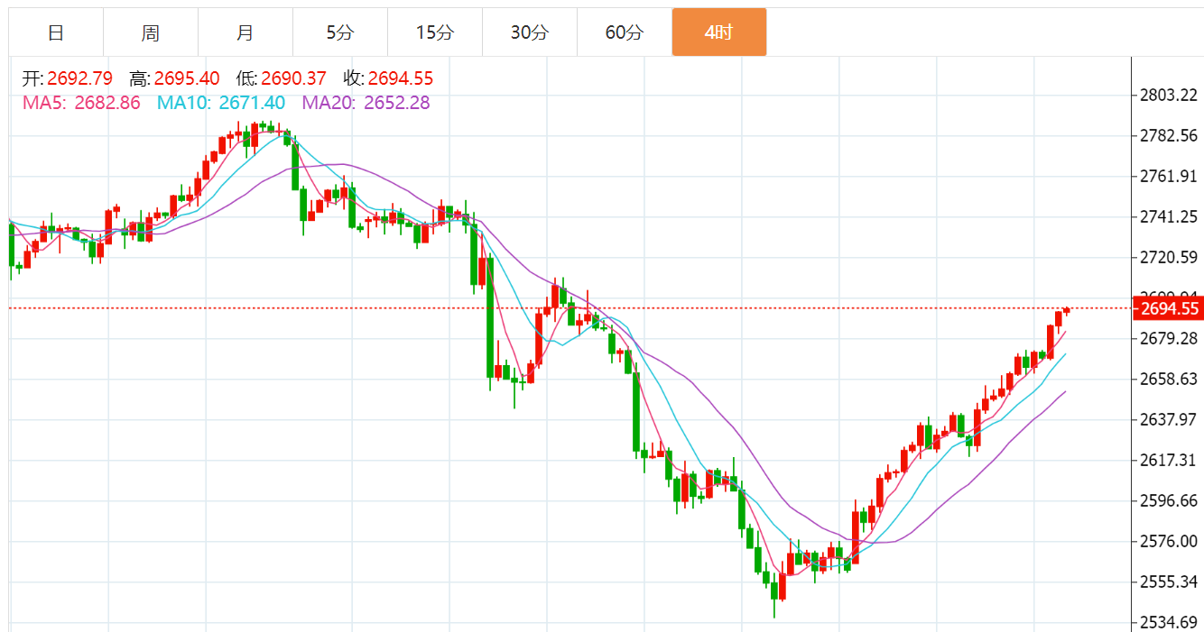 宋宇杰:满眼都是低多看涨,本周金价已涨133美元 时间回到周一,周一早盘延续上周五探底回升的动作,短线拉升30美元,确定低点2565-2566位置 我们做了一个假设,就是这个位置2565-2566就是低点,开始围绕这里逐次向上去上涨,逐次找寻前期的起跌点位置 空间幅度便是围绕上周的150美元,以及本月上半个月的空间226美元 时至今日周五,稳步上涨来到现在最高点是2698-2699区域,差不多133美元,循环上涨,低点抬升,高点逐次上涨突破 日线收取四连阳,一改此前的六连阴,强势扭转局面 周线级别基本确定收阳,只是最终这样是光头光脚的阳K线?还是略有冲高回落线的阳K线? 任务就交给今日周五欧
