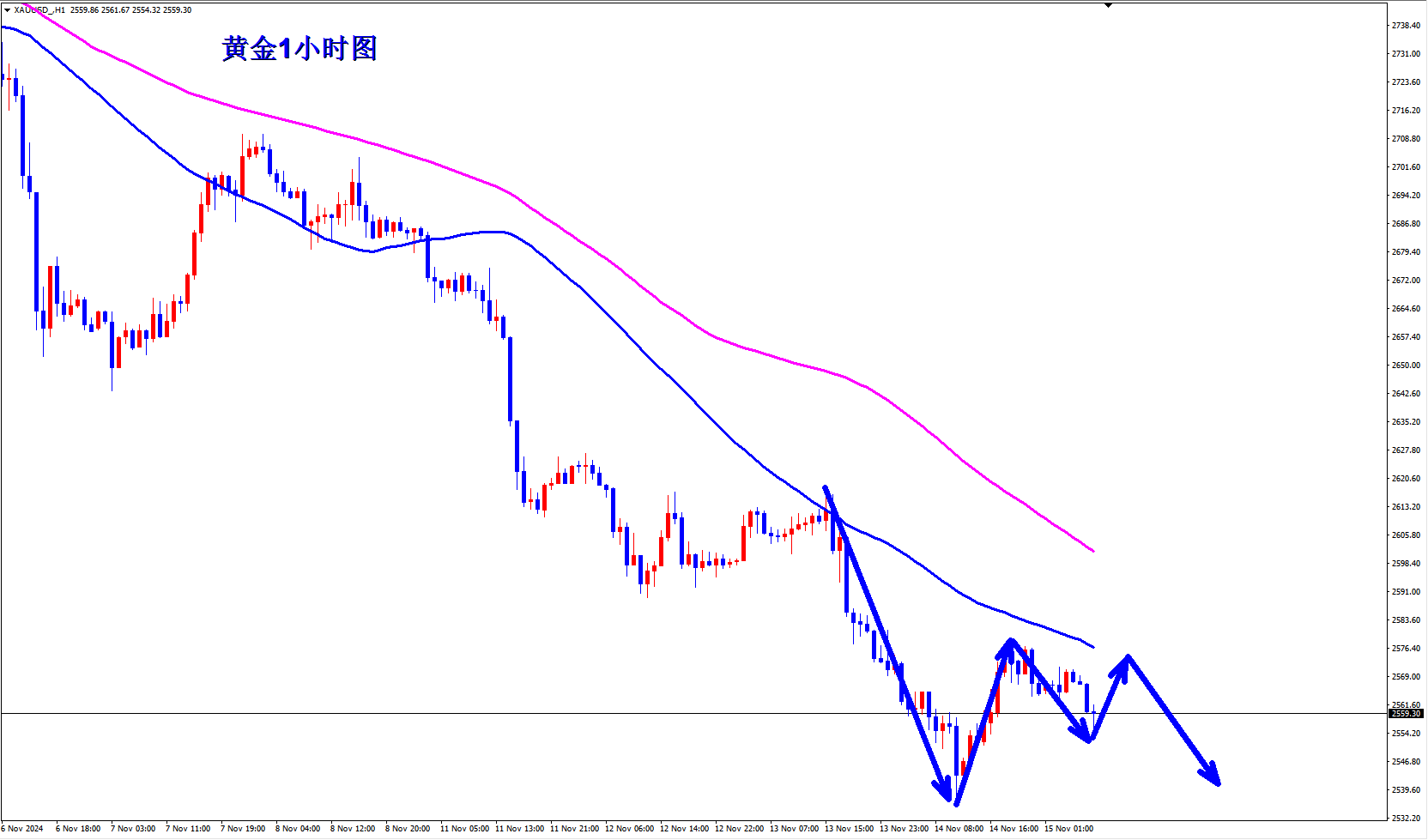 天安点金:11.15 止跌反弹 黄金择机做多 金价在连续五天下跌后保持稳定,本周跌幅料将超过4%,为2021年6月以来的最大跌幅。在鲍威尔讲话之后,交易员们降低了对12月降息的预期,对政策敏感的美国国债收益率飙升。较低的借贷成本和不断下降的收益率往往有利于黄金,因为它不支付利息。 金价已从10月31日的历史高点下跌了约8%,在特朗普上周赢得白宫大选后,跌势进一步加剧。而美元则升至两年来的高点,原因是人们预期,在特朗普担任总统期间,经济增长和企业利润将会走高。美元走强使得以美元计价的大宗商品对大多数买家来说更加昂贵。 尽管如此,金价今年以来仍上涨了20%以上,美联储的货币宽松周期、央行的购买行