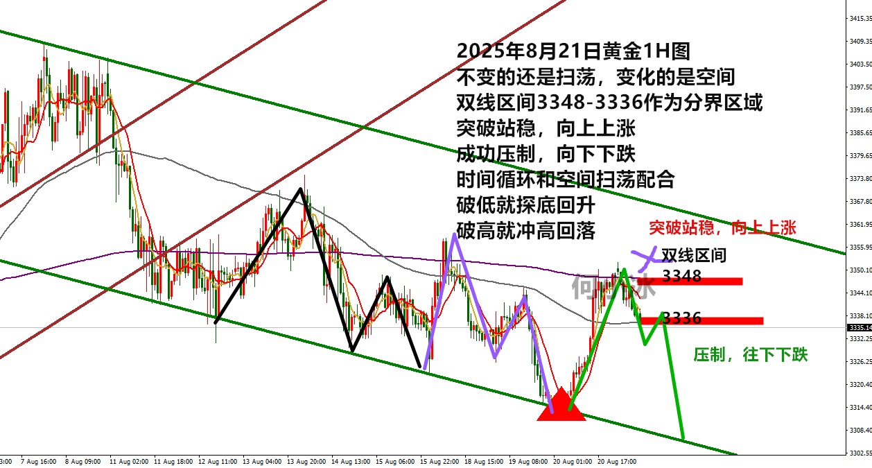 何小冰:金价区间扫荡中找糖吃,3350是今日的分界线 风风火火,还是扫荡,周二美盘的压制下跌,在昨日周三直接一口气拉回来,跌多少,又重新涨回多少,继续将扫荡进行到底 上周后四天都是围绕小时图双线位置上下来回的切换20美元空间,周五反复测试无法突破双线区间 后面的戏码就继续变成了, 碰一下双线区域的位置,就下跌破低,破了低点又探底回升去找双线区间 略微突破,但是不加速,持续徘徊,然后扭头,再去破低点,又重新找双线位置 现在双线区间在3348-3336,这也是我们早盘选择围绕3346-3348高空的原因,往下找寻的便是下轨的3336位置,午后价格压制刚好跌至3336-3334区域,空的利润成功拿